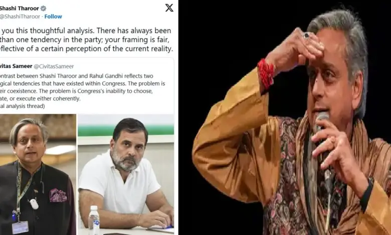 വീണ്ടും വിവാദത്തിന് തിരികൊളുത്തി കോൺ​ഗ്രസ് നേതൃത്വത്തിനെതിരെ ശശി തരൂർ. രാഹുൽ ഗാന്ധിയുടെയും ശശി തരൂരിൻ്റെയും രണ്ട് പ്രത്യയശാസ്ത്ര പ്രവണതയെന്ന എക്സ് പോസ്റ്റ്‌ പങ്കുവെച്ച് ശശി തരൂർ. വിലയിരുത്തൽ ന്യായയുക്തവും പാർട്ടിയിലെ നിലവിലെ യാഥാർത്ഥ്യങ്ങൾ പ്രതിഫലിപ്പിക്കുന്നതാണെന്നും തരൂർ പോസ്റ്റിൽ തരൂർ പറയുന്നു.